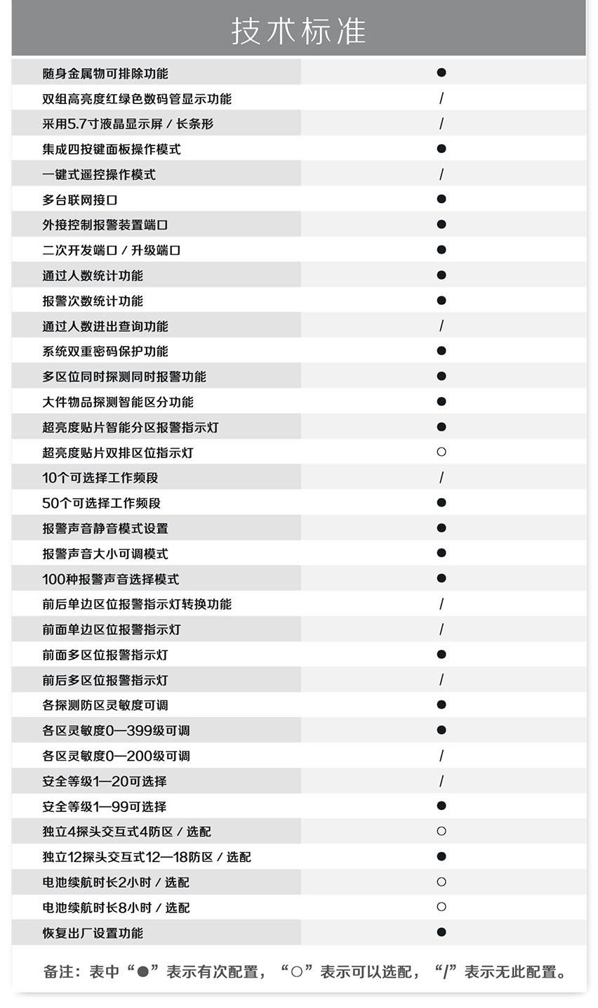 HC-TY300D金屬探測門(橫梁式)感應快、探測準、靈敏度高、抗干擾強、高穩定性,電源設計在主機頂端,防水防潮,非常人性化;能滿足各行業用戶需求。此款安檢門嚴格執行國家《GB15210-2003通過式金屬探測門技術通用技術規范》;