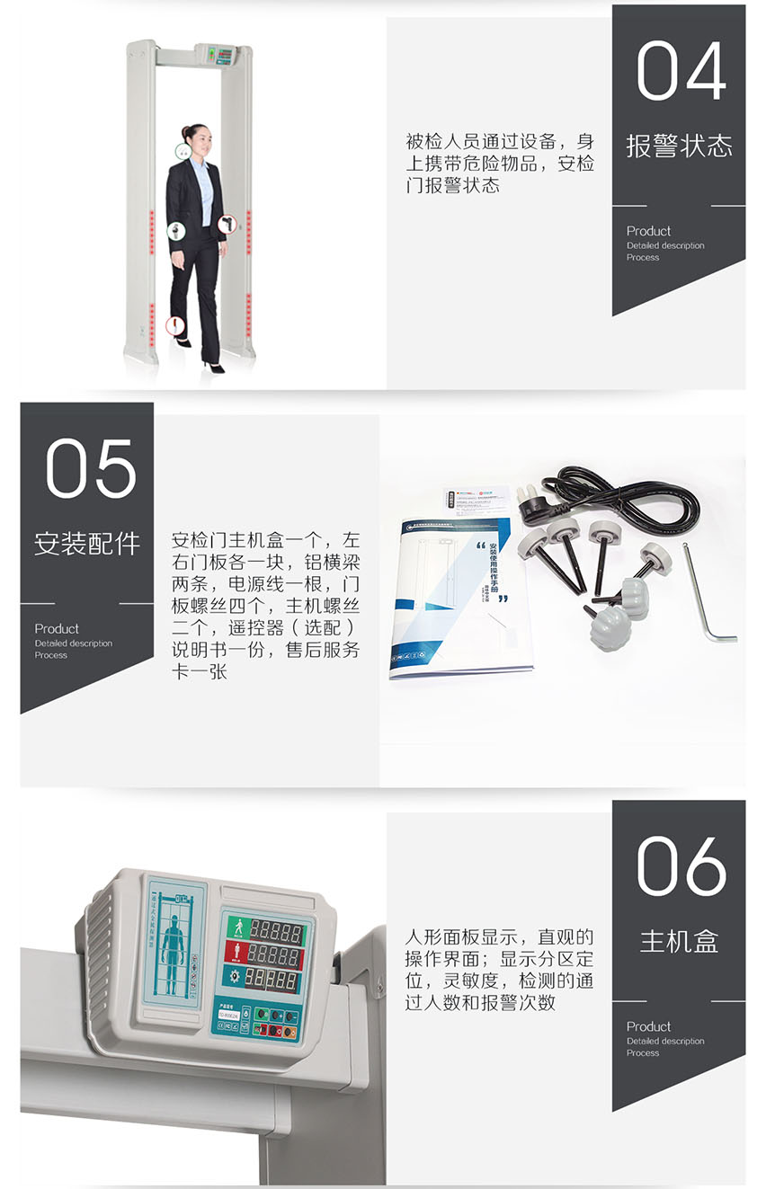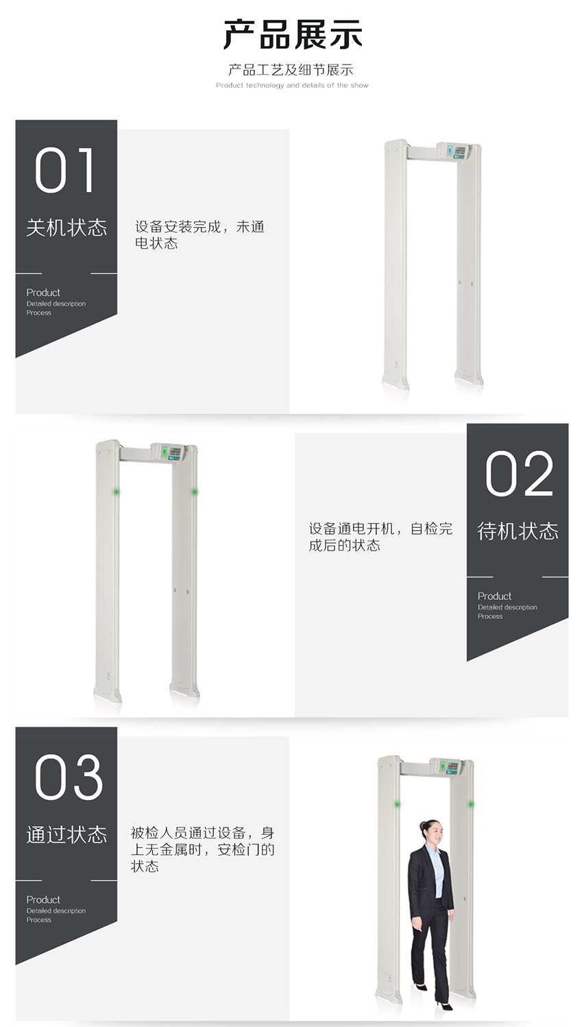 HC-TY300D金屬探測門(橫梁式)感應快、探測準、靈敏度高、抗干擾強、高穩定性,電源設計在主機頂端,防水防潮,非常人性化;能滿足各行業用戶需求。此款安檢門嚴格執行國家《GB15210-2003通過式金屬探測門技術通用技術規范》;。